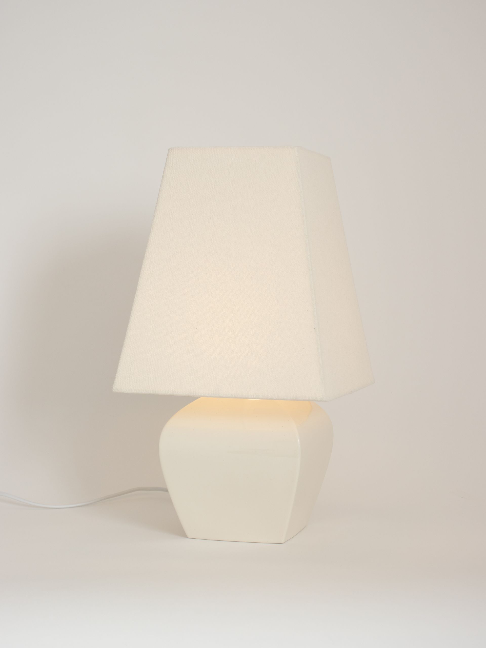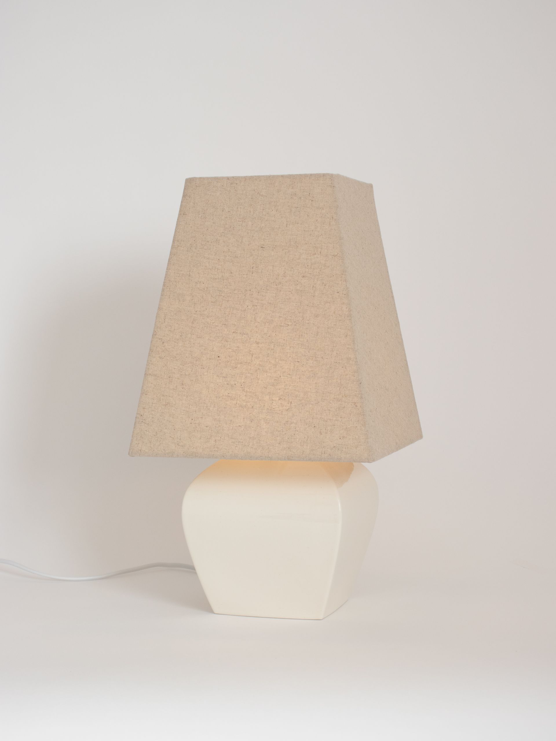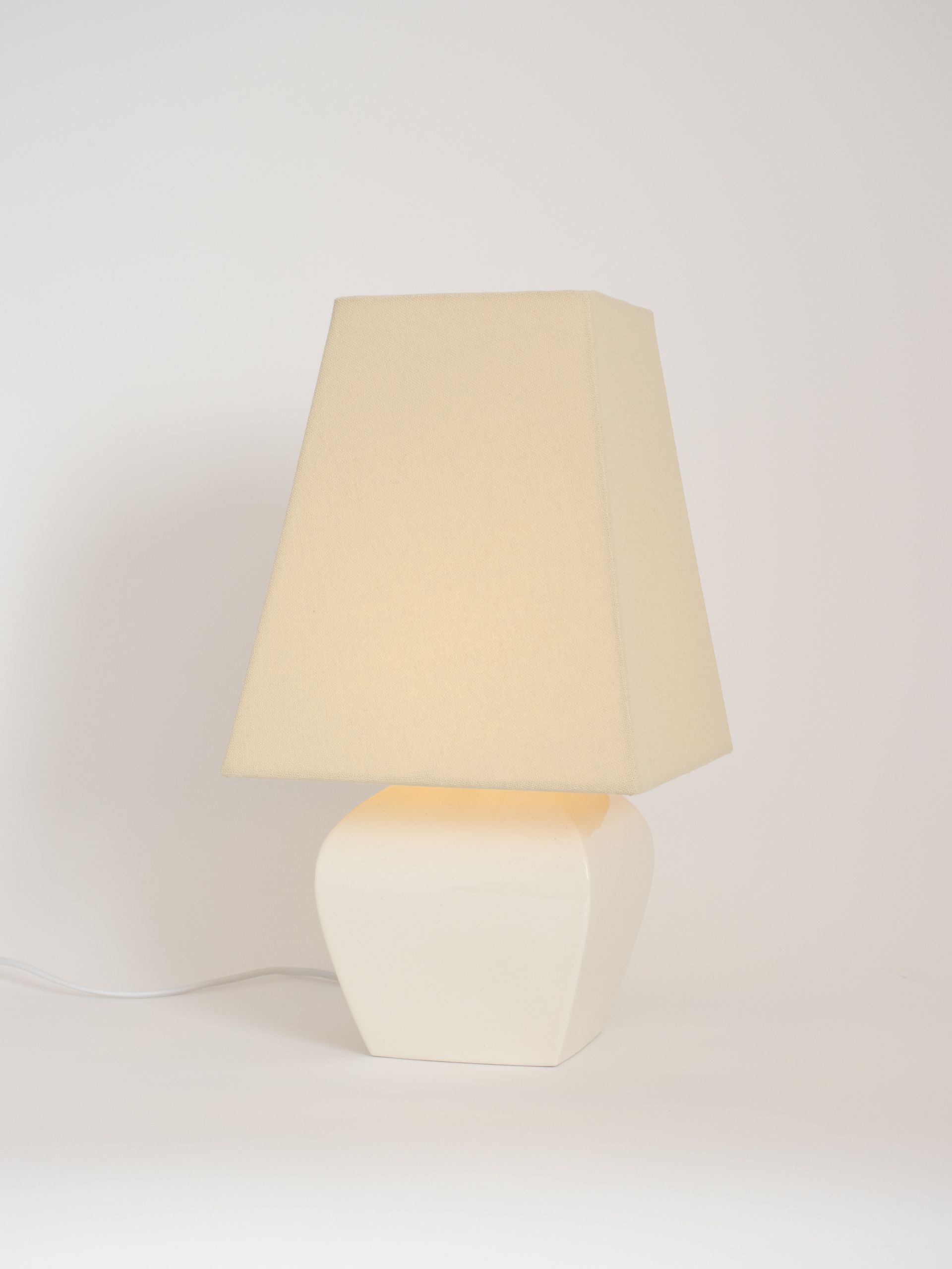 직선의 사각 조명 갓 아래, 유려한 곡선으로 받쳐진 도자기 몸체는 단정하면서도 우아한 분위기로 공간을 정돈합니다.