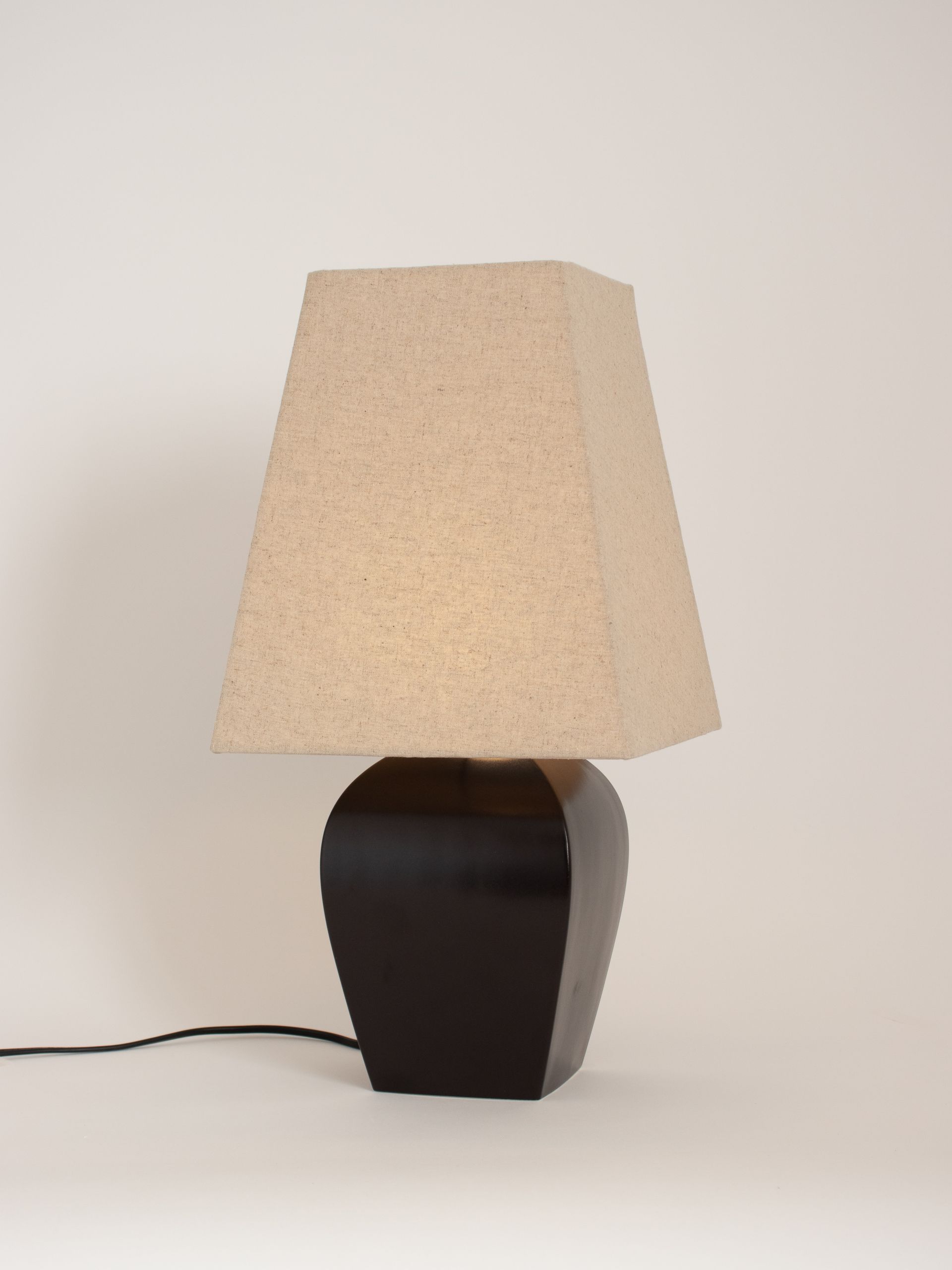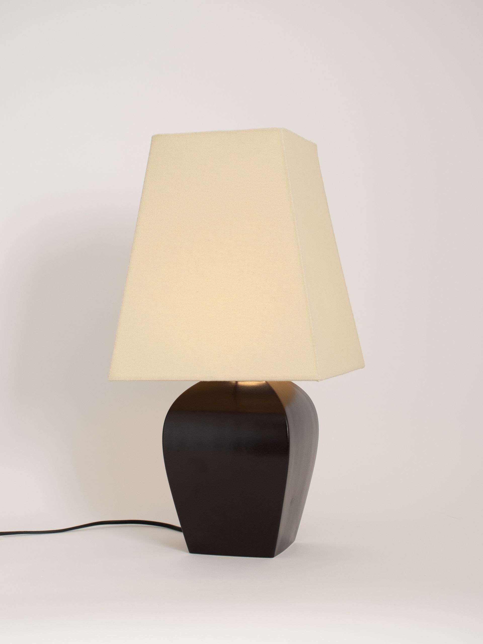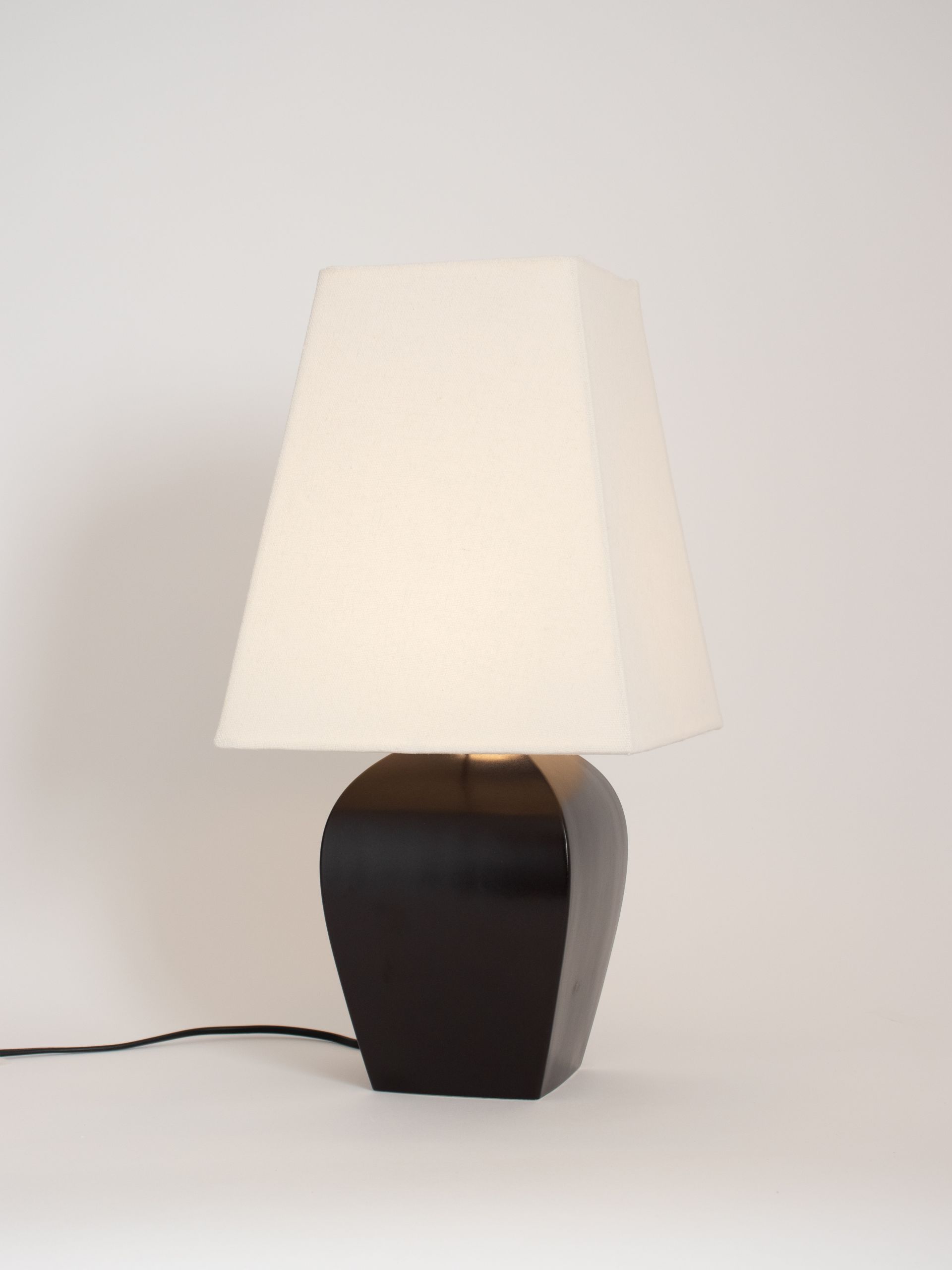 직선의 사각 조명 갓 아래, 유려한 곡선으로 받쳐진 도자기 몸체는 단정하면서도 우아한 분위기로 공간을 정돈합니다.