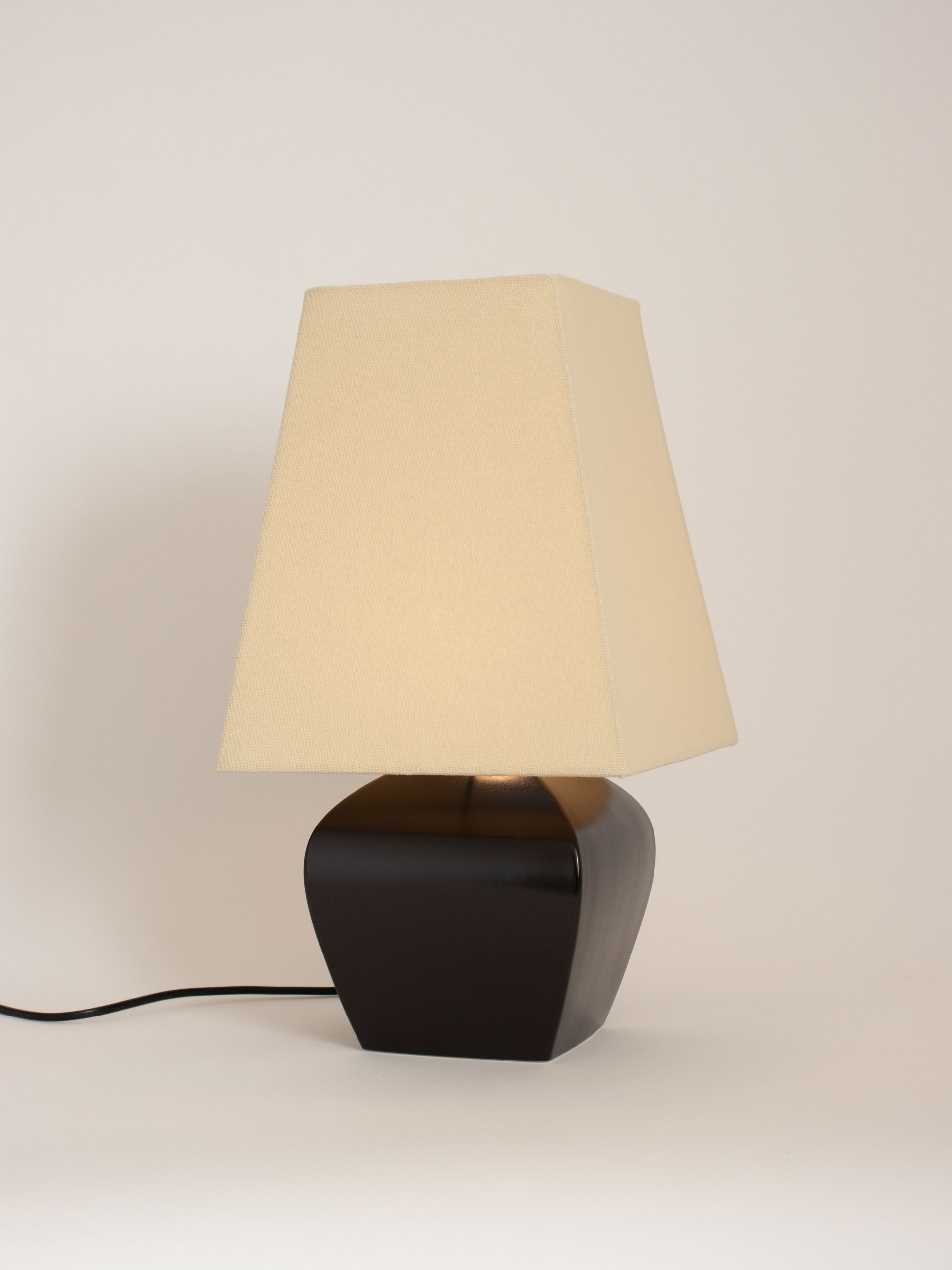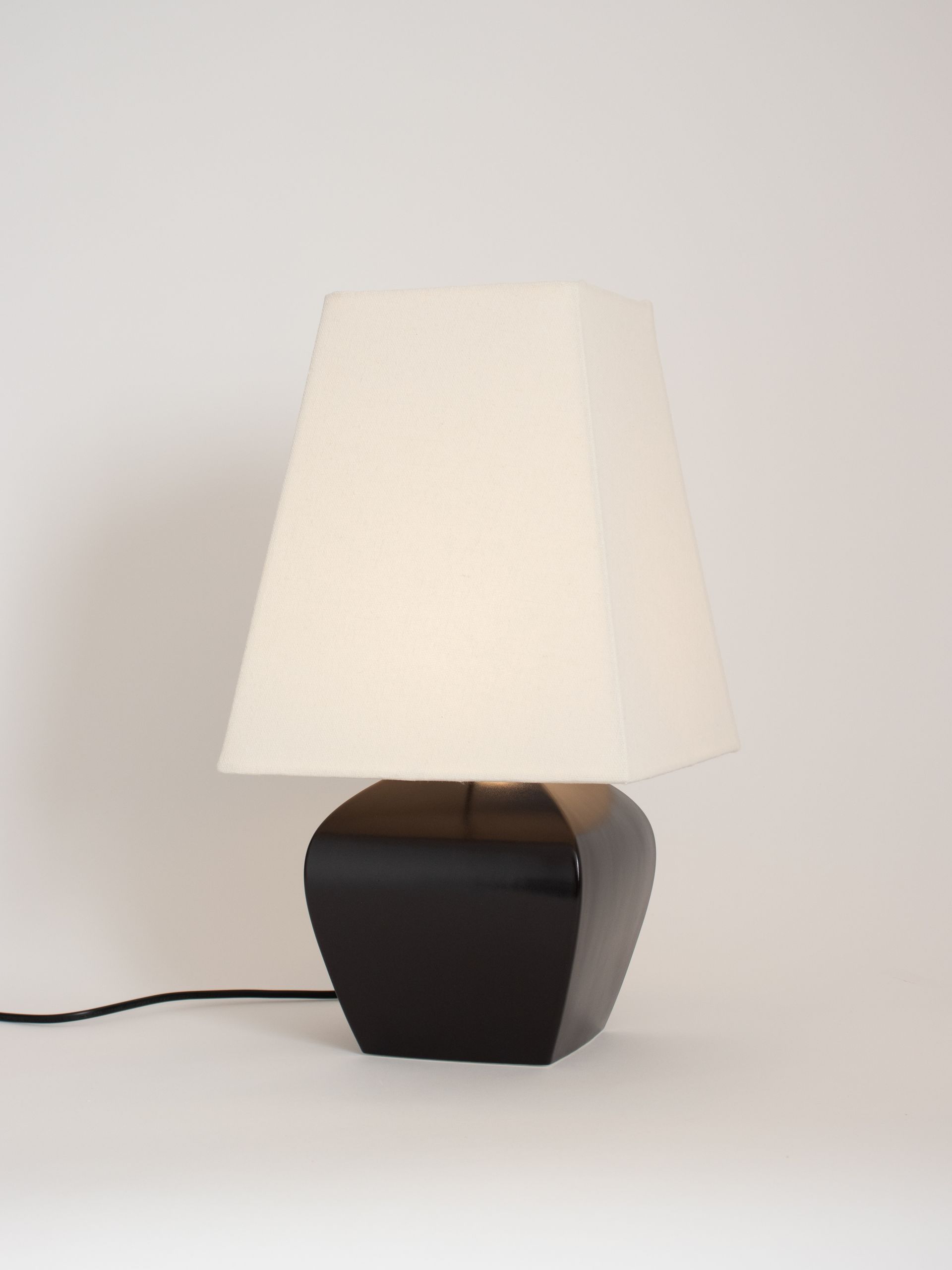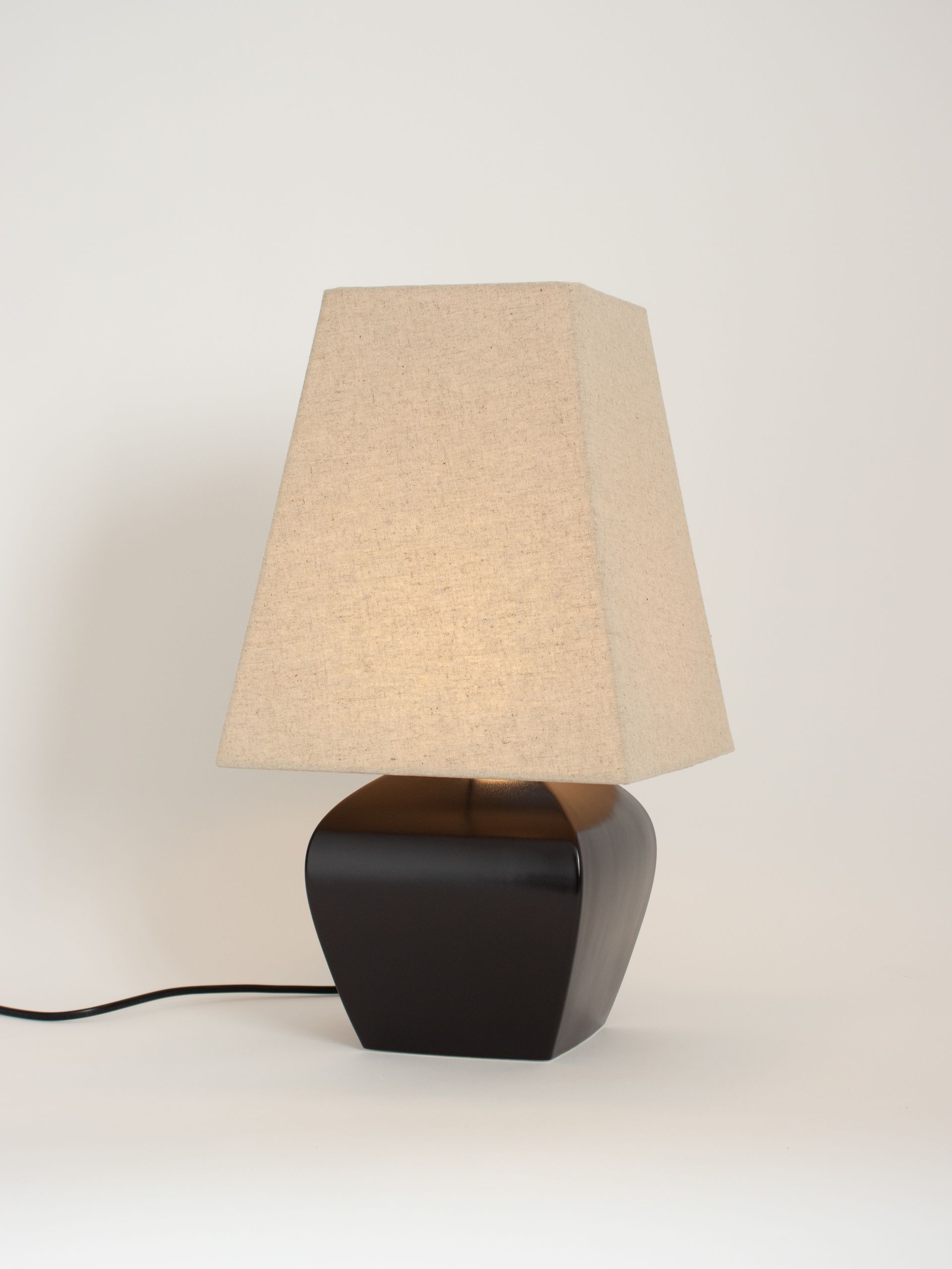 직선의 사각 조명 갓 아래, 유려한 곡선으로 받쳐진 도자기 몸체는 단정하면서도 우아한 분위기로 공간을 정돈합니다.