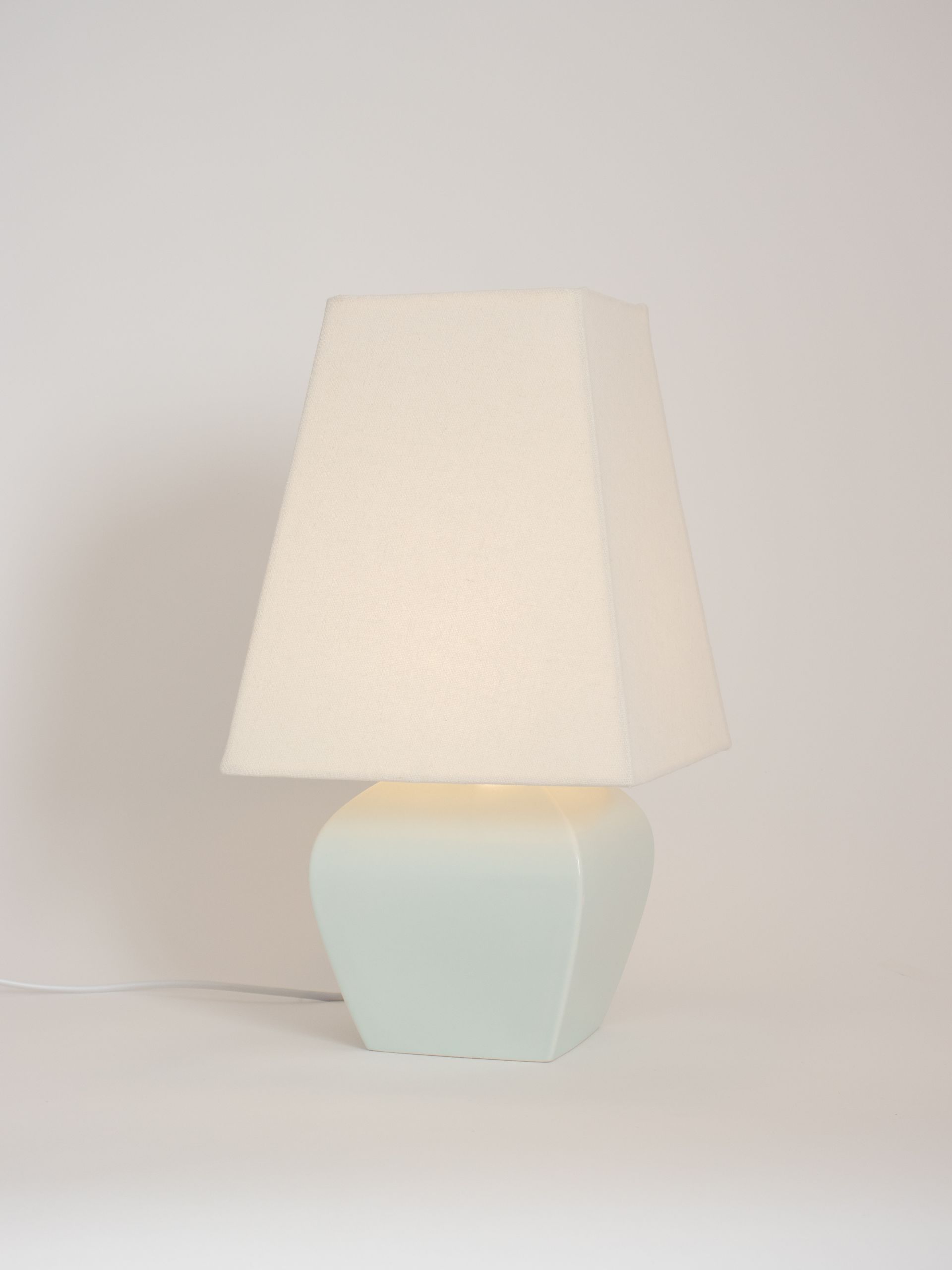 직선의 사각 조명 갓 아래, 유려한 곡선으로 받쳐진 도자기 몸체는 단정하면서도 우아한 분위기로 공간을 정돈합니다.