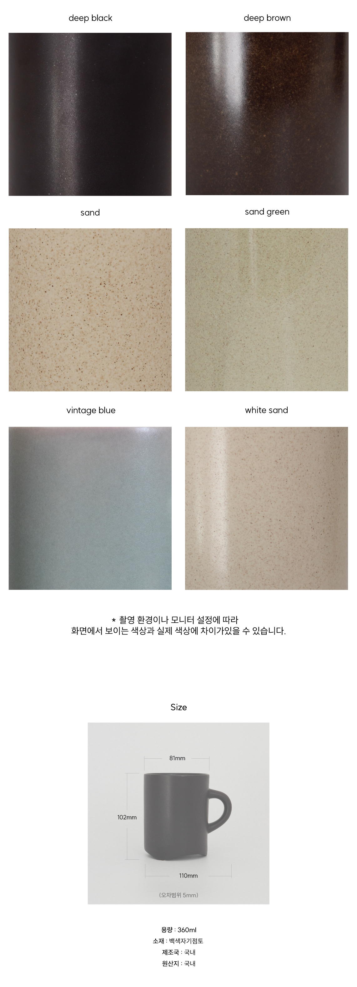 - 소성 중 철에 의해 나타나는 옅은 점과 기포 및 미세한 돌기가 있을 수 있습니다.